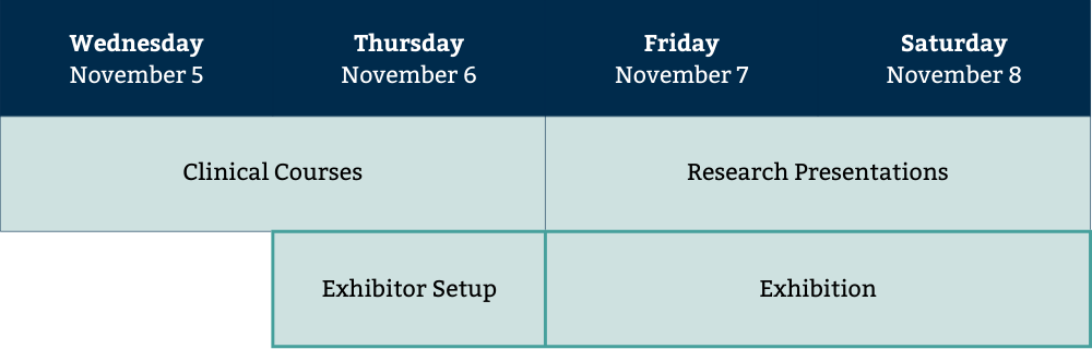 Exhibitor setup will occur in the afternoon of Thursday, November 6. Takedown will occur after exhibition closes on Saturday, November 8.